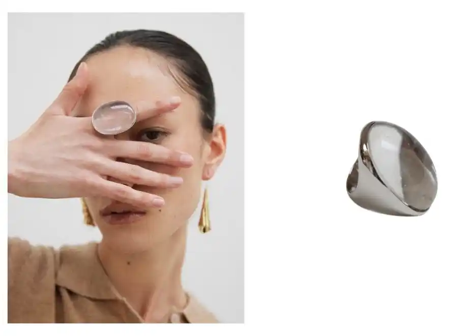 ブランド独自の技術で製作しているクリスタルレジンによるリングです。大胆なサイズ感ながらも繊細な印象を与えるアクセサリーです。 |
