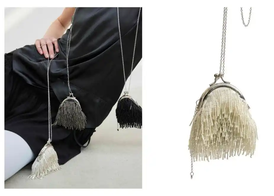 イタリア製ビーズフリンジをハンドメイドで編み込んだ超ミニバッグ。AirPods、リップスティックなどの小物が収納。チェーンを繋げてクロスバッグとしても活用できます。 |