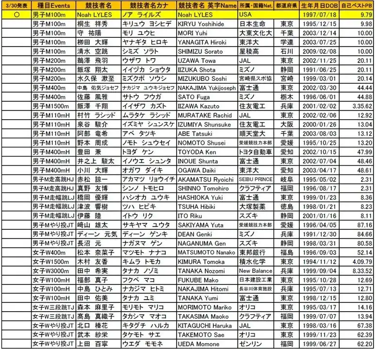 | ■セイコーGGP 国内選手エントリーリスト ※3月30日現在 | |||