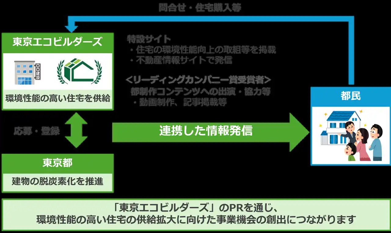 また、特に効果的な取組を実施している事業者には、「東京エコビルダーズアワード リーディングカンパニー賞」を贈呈し、都が制作する普及啓発コンテンツでのタイアップ等を通じて、都民へ発信していきます。 |