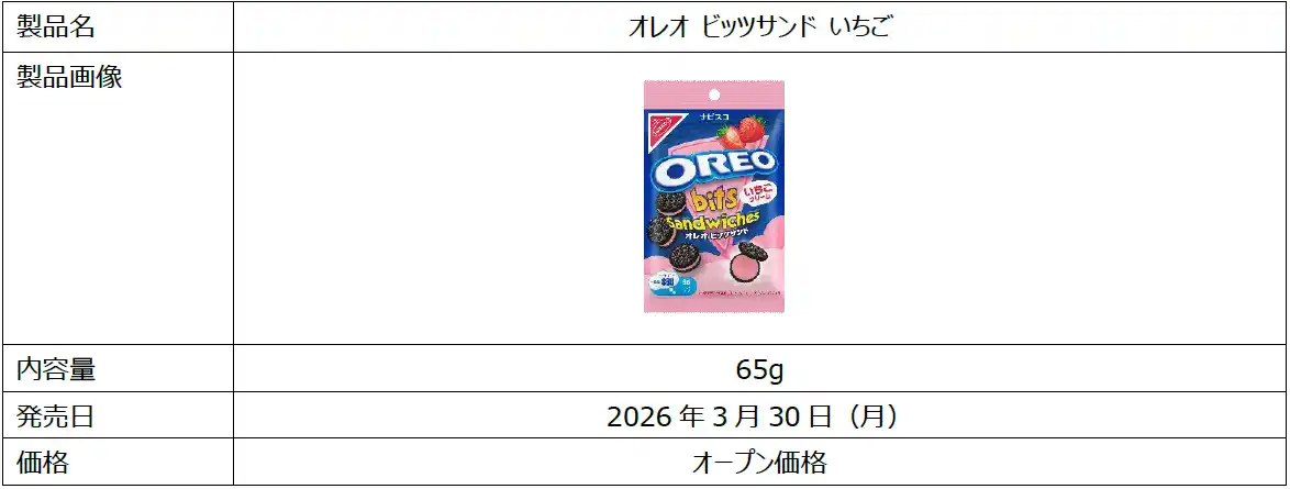 モンデリーズ・ジャパン株式会社(本社:東京都品川区/代表取締役社長:碇祐輔)のビスケットブランド「オレオ」は、ひと口サイズが人気の「オレオ ビッツサンド」シリーズの新しいラインアップとして、「オレオ ビッツサンド いちご」を2026年3月30日(月)より全国で発売します。 |