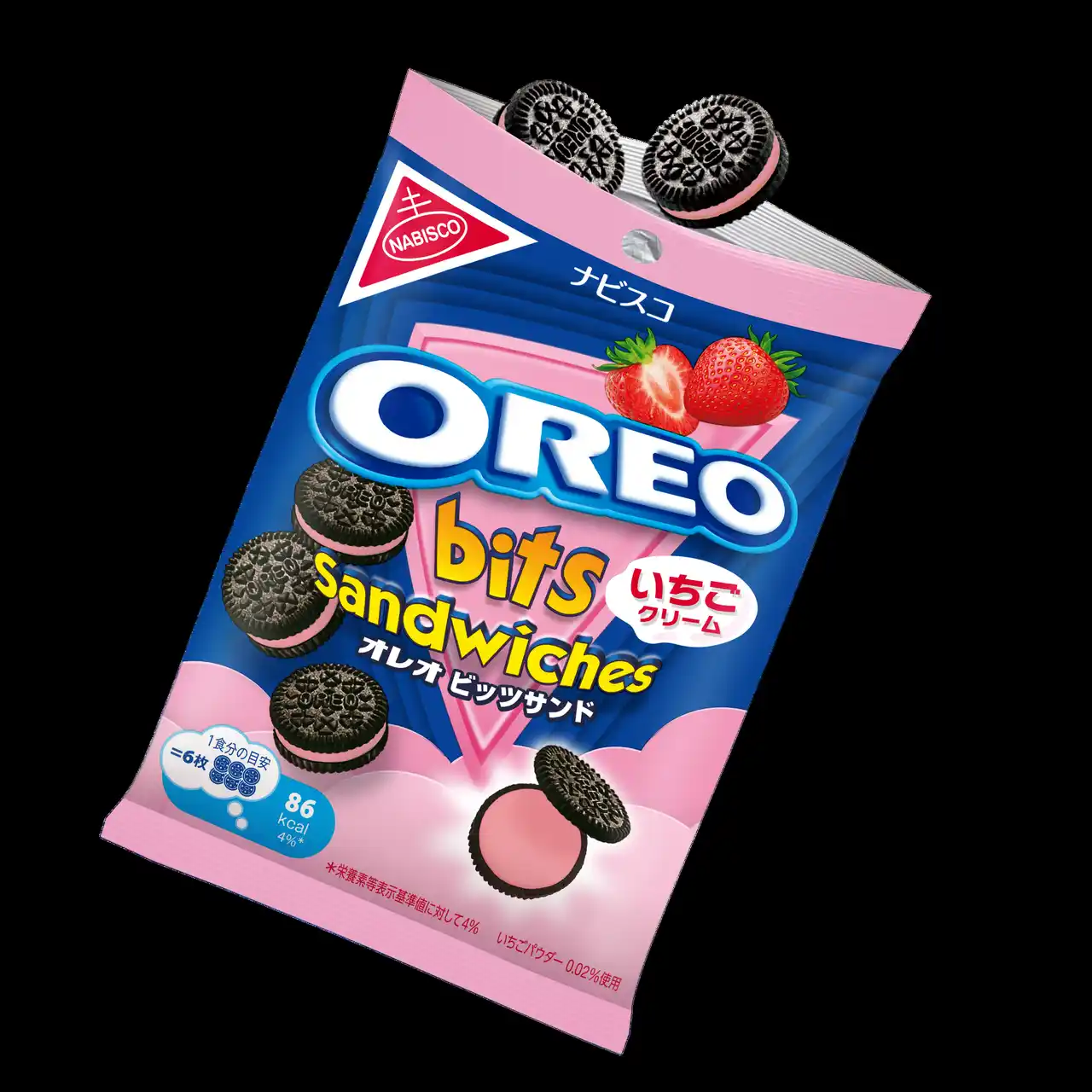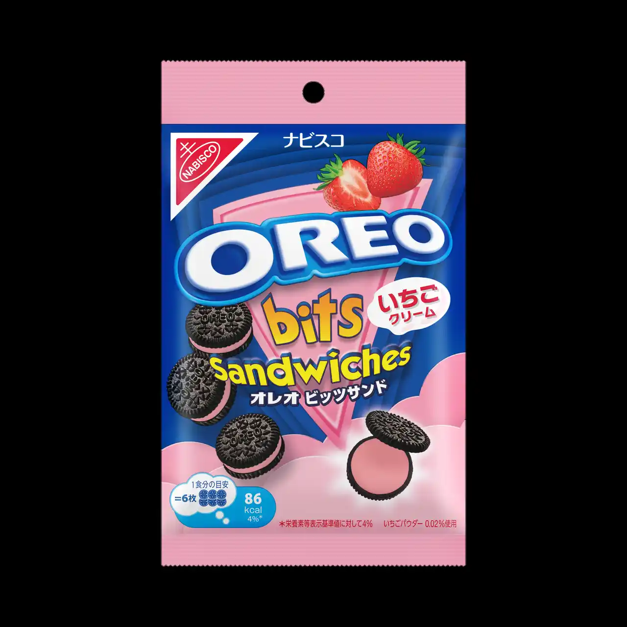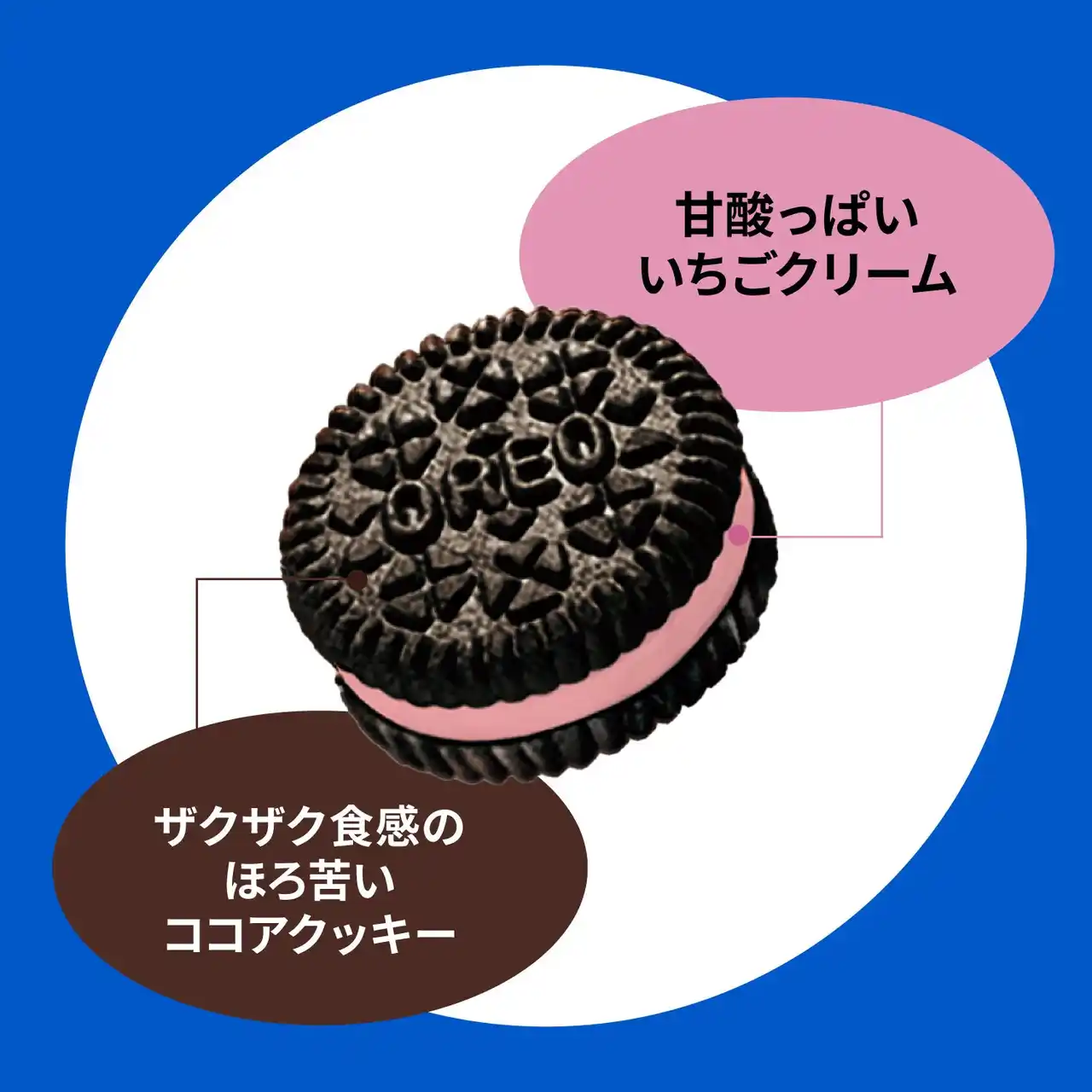 パッケージは、オレオのブランドカラー“青”に映えるピンクといちごのイラストが施されており、甘酸っぱい美味しさをポップに表現したデザインです。 |