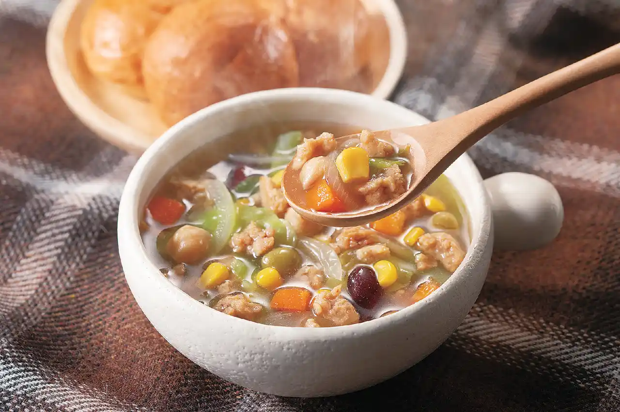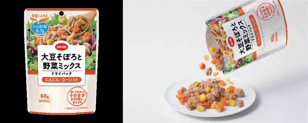 「CO・OP 大豆そぼろと野菜ミックスドライパック」は、そぼろ状にした大豆ミートと彩りの良い野菜をミックスした商品です。大豆たんぱくに加え、野菜も一緒にとることができ、組合員の「家族のために、健康でバランスのいい食事をしたい」という要望にお応えした、たんぱく質を手軽にとれる新商品です。 |
