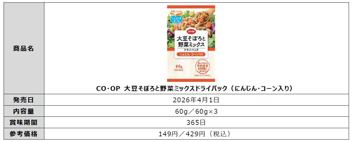 日本生活協同組合連合会(略称:日本生協連、代表理事会長:新井ちとせ)は、下ごしらえが不要で使いやすいドライパックシリーズから、「CO・OP 大豆そぼろと野菜ミックスドライパック(にんじん・コーン入り)」を2026年4月1日より発売します。 |