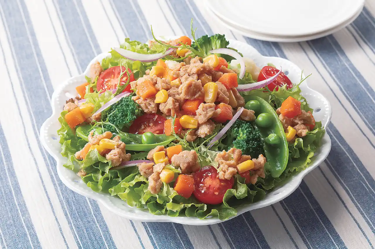 そぼろ状にした大豆ミートに彩りの良い野菜(にんじん・コーン)をミックスしました。水戻し不要で、袋から開けてそのまま使うことができ、手軽にたんぱく質がとれます。サラダやスープ、和え物などと組み合わせて少し手を加えるだけで、手軽に一品料理が完成します。 |