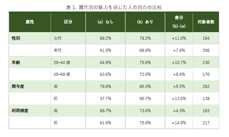 ベビーカーの効果は、性別や年齢を問わず確認されました。女性では11ポイント(68.2%→79.2%)、男性では7.9ポイント(61.0%→68.9%)の向上が見られました。年齢別では、20~44歳で10.7ポイント、45~69歳で8.4ポイントの向上が確認されています。また、公園への態度的関与が低い層では13.0ポイント(37.7%→50.7%)、公園の利用頻度が低い層では14.0ポイント(61.0%→75.0%)と、効果がより大きくなりました。つまり、ベビーカーは従来公園に関心の薄かった層を新たに惹きつける要因として機能しており、都市の潜在的な参加者層の拡大に寄与することが示されました。 |
