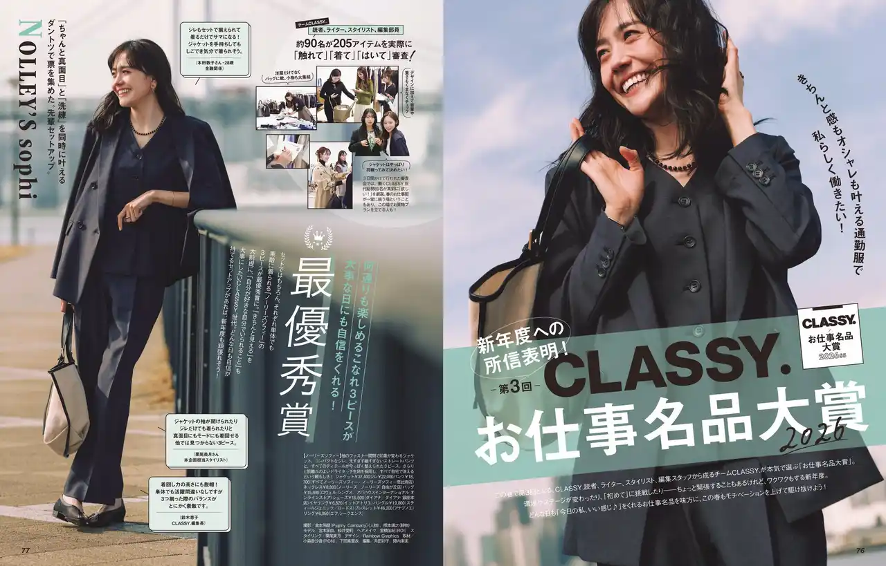 2026年3月発売号で3回目の開催となる「CLASSY.お仕事名品大賞」。アパレル、バッグ、靴など様々なブランドから新年度にお勧めしたい、お仕事名品アイテムのエントリーを募り、一次審査を通過した全205アイテムを対象に、約90名の『CLASSY.』読者、CLASSY.リーダーズ、編集部スタッフが実際に試着し、リアル投票を行いました。1人につき、大賞1点と各部門賞を選び、厳正な審査の結果、「最優秀賞」、「セットアップ賞」、「ジャケット賞」、「トップス賞」、「美脚パンツ賞」、「しごできバッグ賞」、「楽ちんシューズ賞」、「高機能名品賞」、「チームCLASSY.賞」が決定いたしました。 |