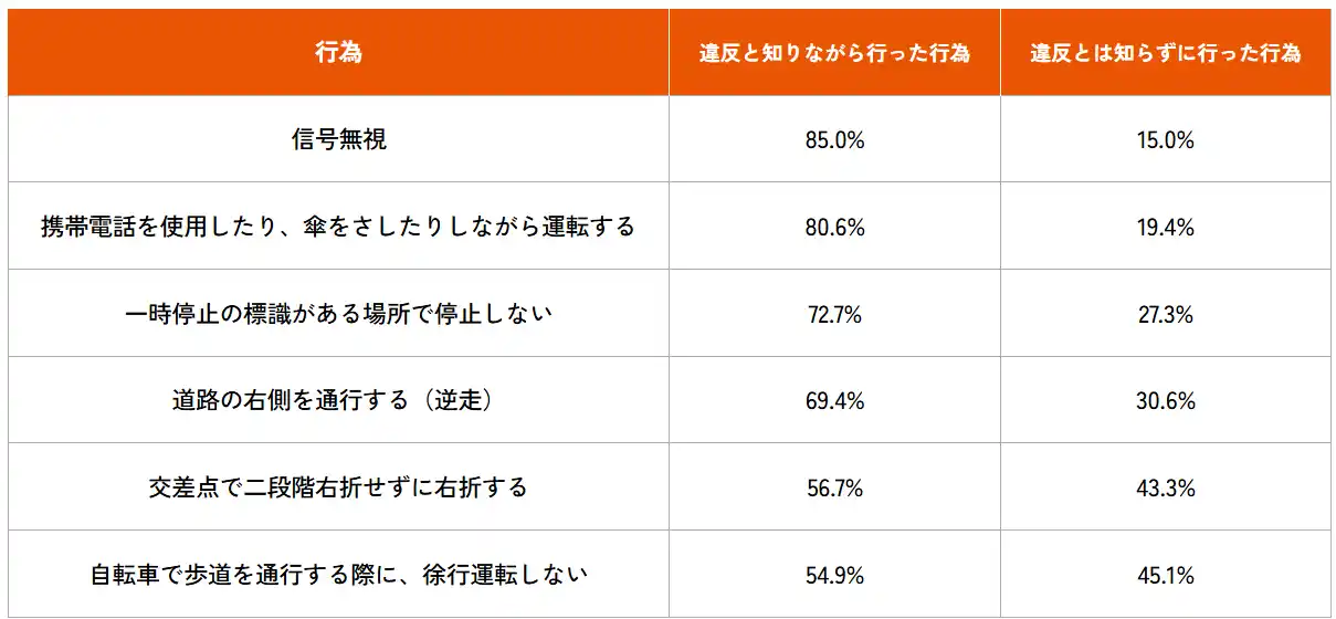 また、「信号無視」と「ながら運転」は、違反と知りながら行ったことがある行為としても多く、それぞれ85.0%、80.6%と上位を占めました【表5】。 |
