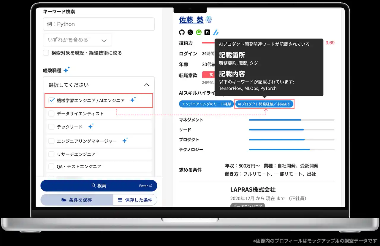 | 「LAPRAS」に登録された職務要約・職歴情報などをAIが解析し、AIを活用したプロダクトやシステムの開発に携わった経験、またはAIプロダクト開発への強い志向があると判定された候補者に自動でラベルを付与します。 | |||||||||