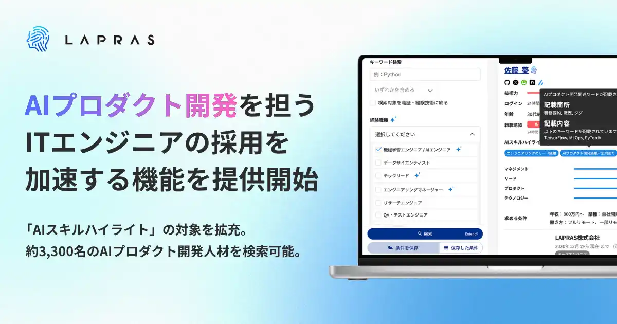 | LAPRAS株式会社(所在地:東京都渋谷区、代表取締役:染谷健太郎、以下、LAPRAS)は、エンジニア採用サービス「LAPRAS」において、候補者の潜在的なスキル・経験をAIが自動判別して可視化する「AIスキルハイライト」機能に、新たに「AIプロダクト開発経験/志向あり」ラベルを追加しました。これにより、職歴上では見えづらかった潜在的な経験者や志向を持つ候補者も含め、AIプロダクト開発を担えるエンジニアを見過ごすことなく発見できるようになります。 | |||||||||