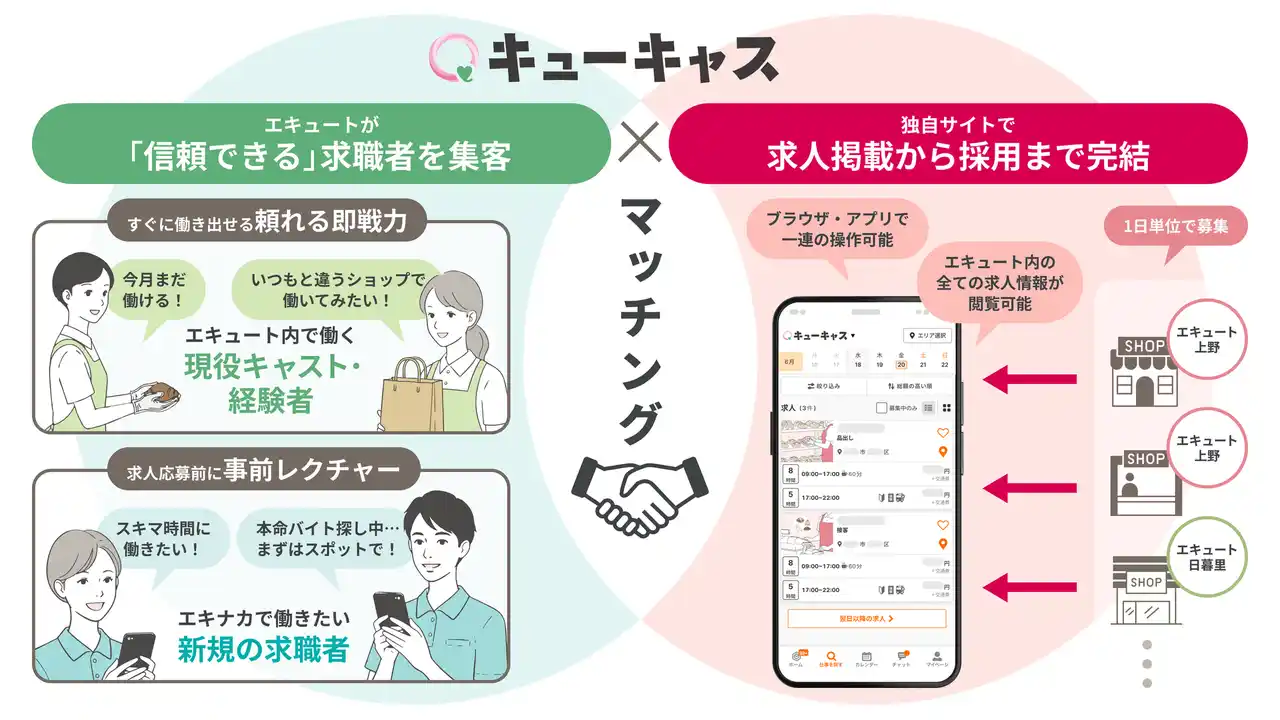 株式会社JR東日本クロスステーション デベロップメントカンパニー(本社:東京都渋谷区、カンパニー長:白田 義彰、以下「JR-Cross」)と株式会社Matchbox Technologies(本社:新潟県新潟市、代表取締役社長:佐藤 洋彰、以下「マッチボックステクノロジーズ」)は、2026年4月から7月末までの期間、エキナカ商業施設「エキュート」内のショップの人材確保と、安心な就業を支援する新サービス「キューキャス」の実証実験を実施します。