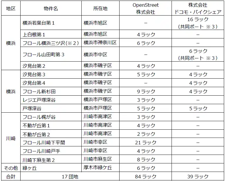 神奈川県住宅供給公社(所在地:横浜市中区、以下「公社」)、OpenStreet株式会社(所在地:東京都港区)及び株式会社ドコモ・バイクシェア(所在地:東京都港区)は、この度、公社が所有する団地において、シェアサイクルポート※1(以下、「ポート」)の設置を拡大し、2026年4月から順次運用を開始いたします。 |