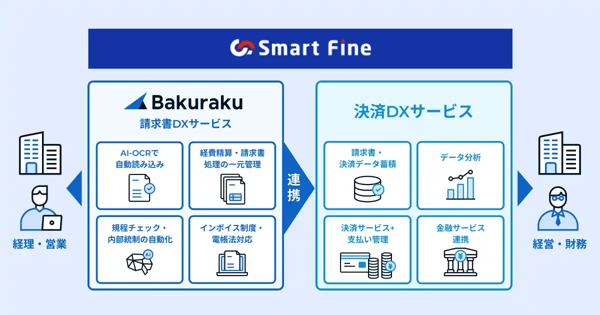 広島銀行が2025年6月から提供開始した、「請求書DX」と「決済DX」を組み合せた独自サービス「〈ひろぎん〉Smart Fine(以下「Smart Fine」)」と、LayerXが提供する「バクラク請求書受取」を連携させることで、請求書の受領から支払処理までを一気通貫でデジタル化します。 |