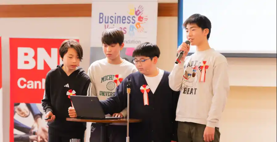 校内選抜を勝ち抜いた優勝チームは、2026年2月、現役経営者たちが集うビジネスミーティング「BBM(Big Business Meeting)」に登壇。少子高齢化に伴う2030年の人手不足問題に切り込む会社の事業案を堂々とプレゼンし、大人たちから大きな喝采を浴びました。 |