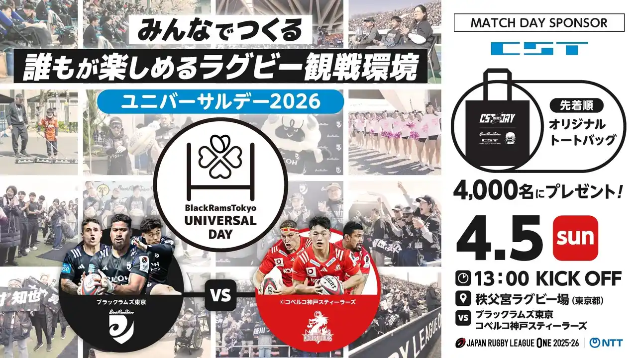 4月5日(日) に秩父宮ラグビー場にて開催されるNTTジャパンラグビー リーグワン2025-26 第14節 コベルコ神戸スティーラーズ戦おいて、「”みんなでつくる”誰もが楽しめるラグビー観戦環境 ~ユニバーサルデー2026~」を実施いたします。 |
