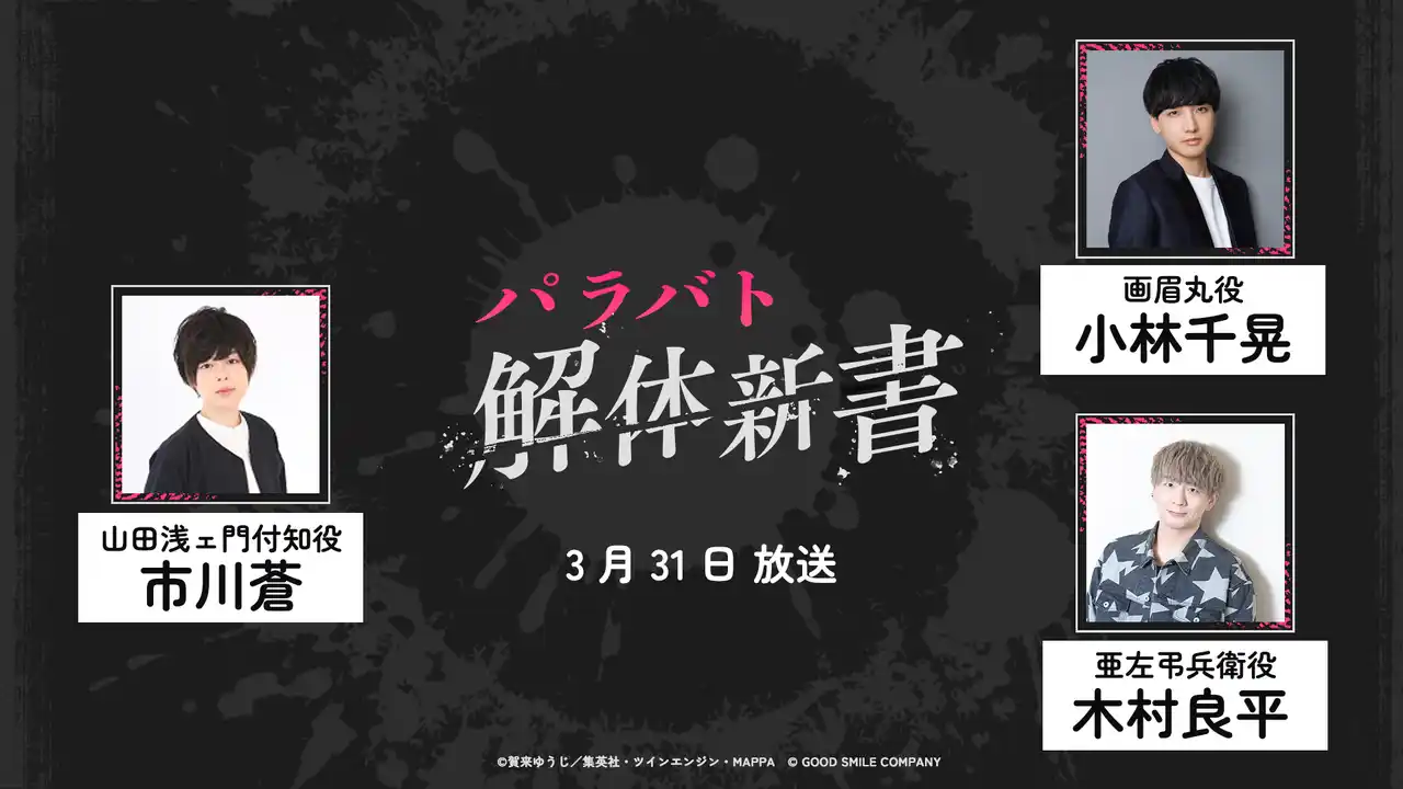 3月31日(火) にグッスマ公式YouTubeチャンネルにて、Webラジオ『#パラバト解体新書』を配信予定です。TVアニメ『地獄楽』に加え、『#パラバト』に関する最新情報をお届けいたします。パーソナリティの山田浅ェ門付知役・市川蒼さん、第6回のゲストには画眉丸役・小林千晃さん、亜左弔兵衛役・木村良平さんを迎え、TVアニメ第二期の放送を振り返り、ここでしか聞けないエピソードをお楽しみいただけます。番組連動でプレゼントキャンペーンや、4月のゲーム更新内容告知も予定しています。 |