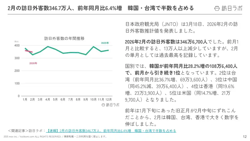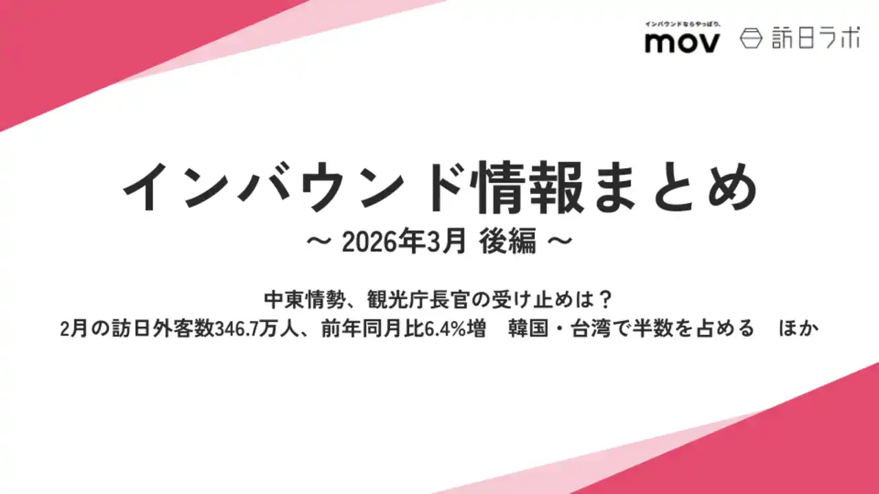 業界最大級のインバウンドビジネスメディア「訪日ラボ」及び 店舗向け集客一元化プラットフォーム「口コミコム」を運営する株式会社mov(代表取締役:渡邊 誠、本社:東京都渋谷区、以下mov)は、「インバウンドに関する最新トレンド・データ」「政府・自治体・企業などのインバウンド関連の取り組み」をはじめ、インバウンド対策に役立つニュースをまとめた「インバウンド情報まとめ【2026年3月後編】」を公開しました。 |