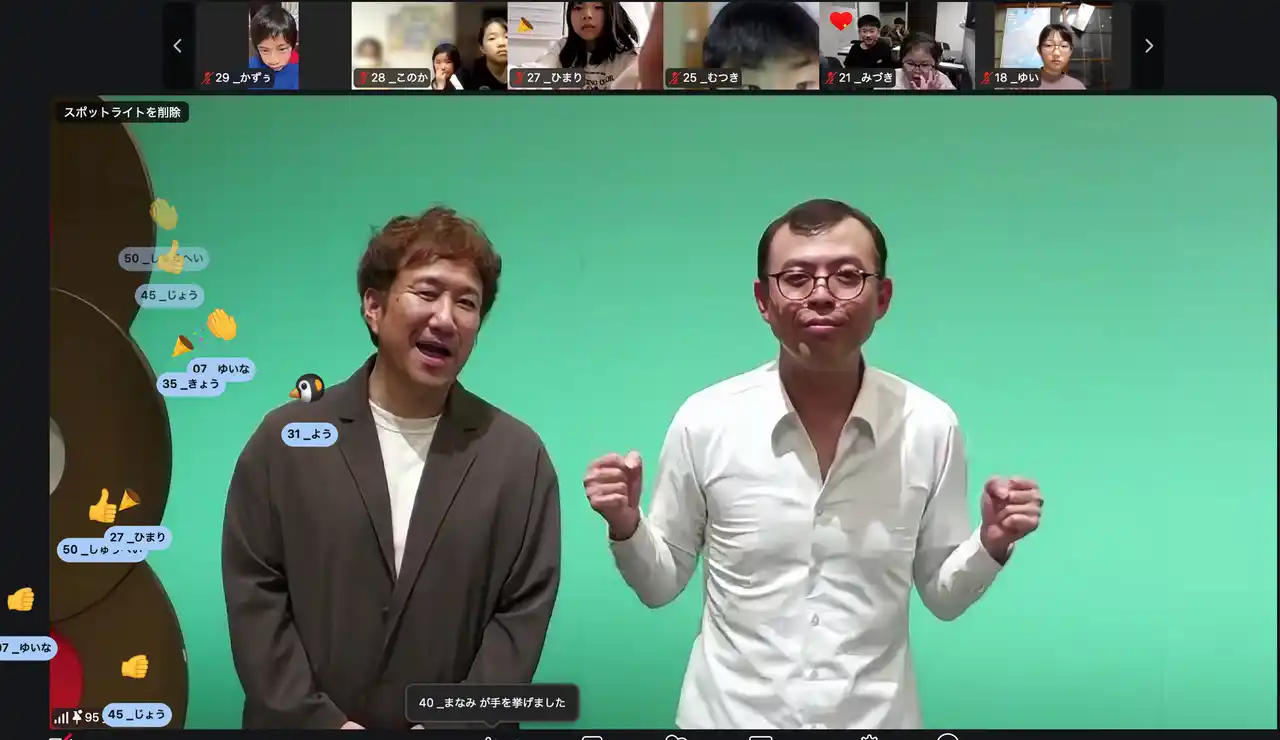 両回共通で行われたコミュニケーションタイムでは、「今日学んだこと」を発表してもらい、「韻をふむのが楽しかった!」「替え歌をつくれたのが嬉しかった!」といった声があがりました。さらに、有志の中から選ばれた参加者には、ジョイマンさんがその子の名前を使ったオリジナルラップを即興でプレゼント。照れながらも嬉しそうに画面の向こうで笑顔を浮かべていました。 |