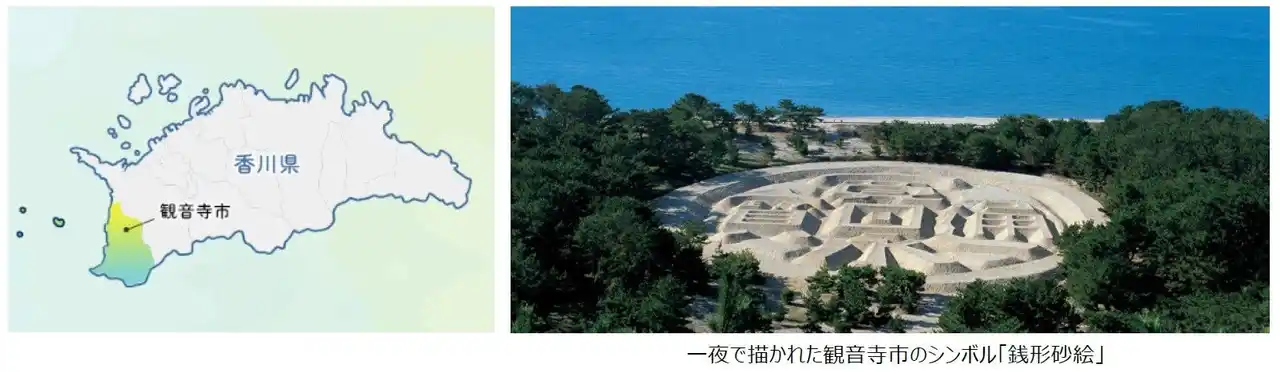 観音寺市は、香川県の西端、瀬戸内海に面した西讃地域の中心都市で四国のほぼ真ん中に位置しています。市域には三豊平野や有明浜が広がり、南側には讃岐山脈の雲辺寺山があり、山・海・平野が調和した豊かな自然環境に恵まれています。琴弾公園内の「銭形砂絵(寛永通宝)」をはじめ、四国霊場第68番札所「神恵院」、第69番札所「観音寺」などの歴史・文化資源も有しています。これらの地域資源や産業を背景に、観音寺市では多様な分野において地域の特性を活かした事業を展開しています。 |