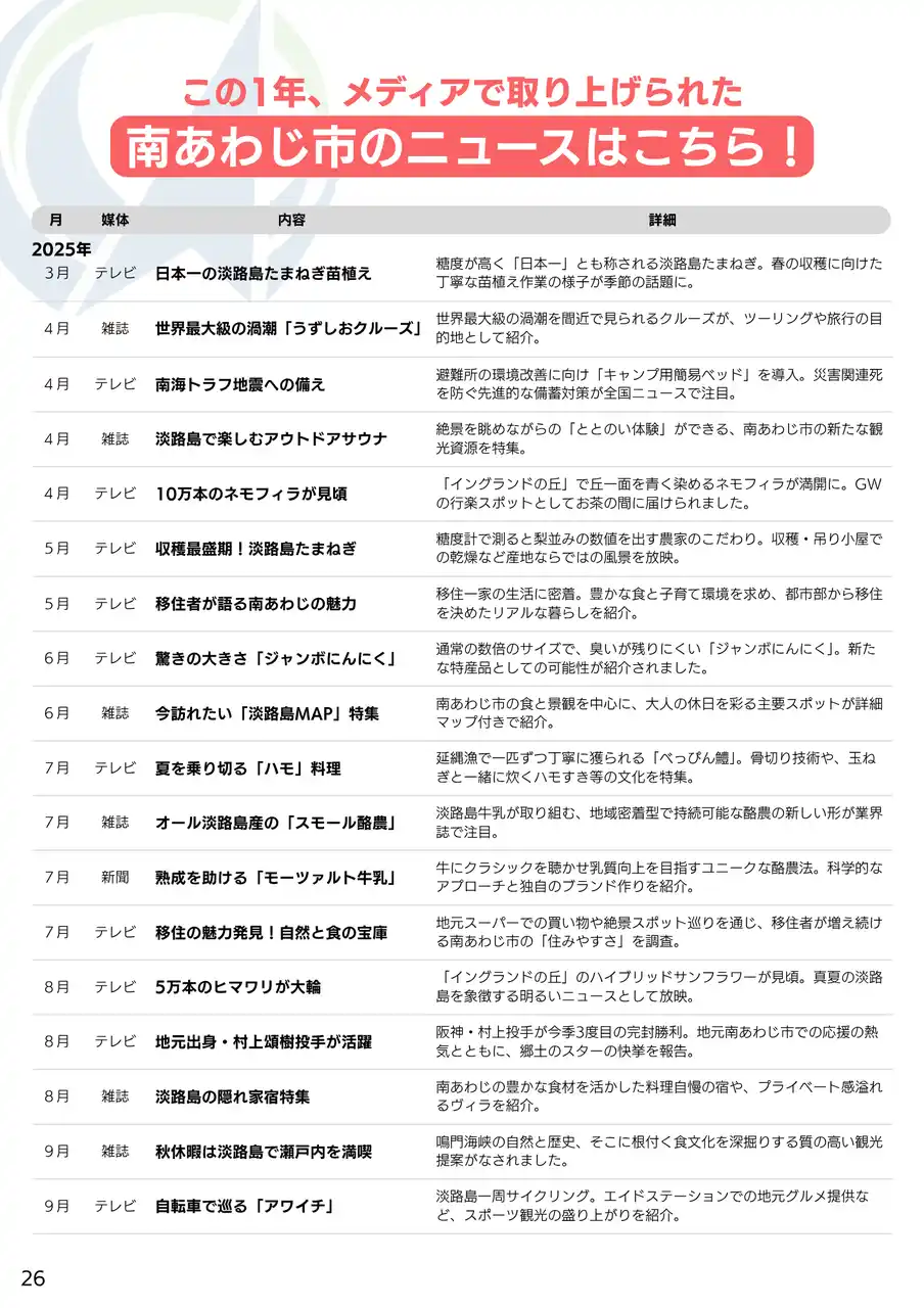 「この1年、メディアで取り上げられた南あわじ市のニュース」を多数ご紹介!(P.26) |