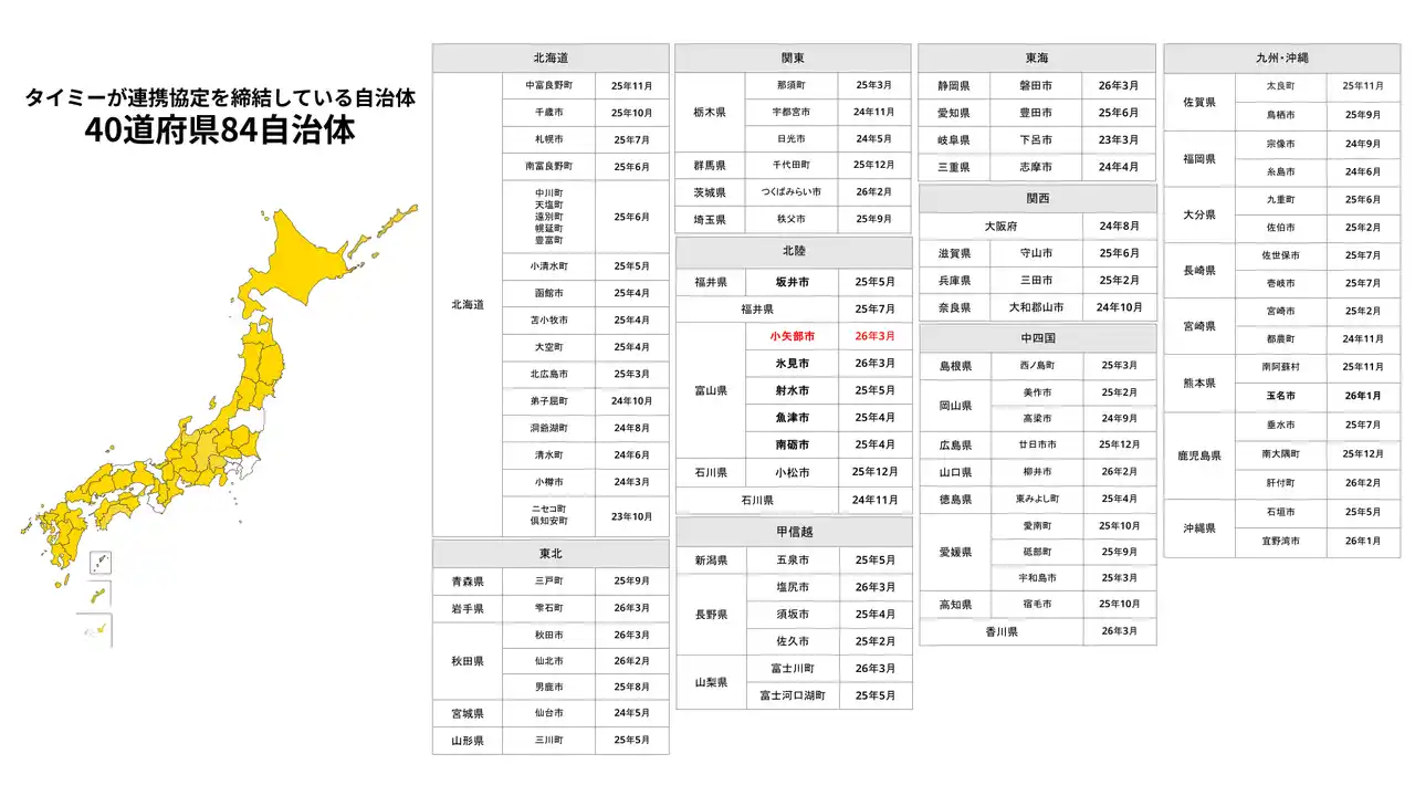 当社はこれまで40道府県・83自治体と連携協定を締結しており、今回の小矢部市との連携は40道府県・84自治体目となります(※2)。 |