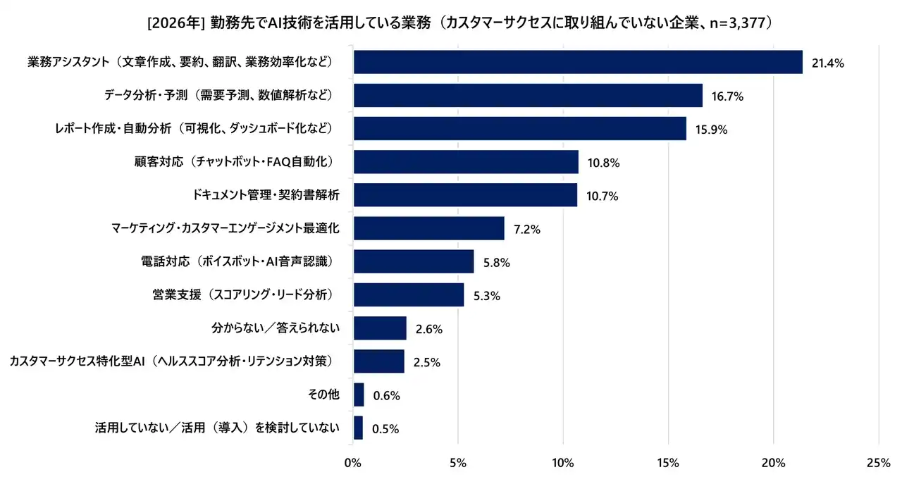 さらに、実際にどのような業務でAI技術が活用されているかを比較したところ、活用の「質(方向性)」にも違いが見られました。カスタマーサクセスに取り組んでいない企業では、「業務アシスタント(21.4%)」、「データ分析・予測(16.7%)」、「レポート作成・自動分析(15.9%)」など、個人の事務処理の効率化にAIを充てている傾向があります。 |