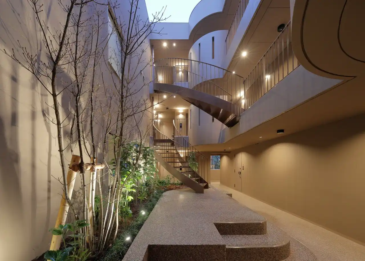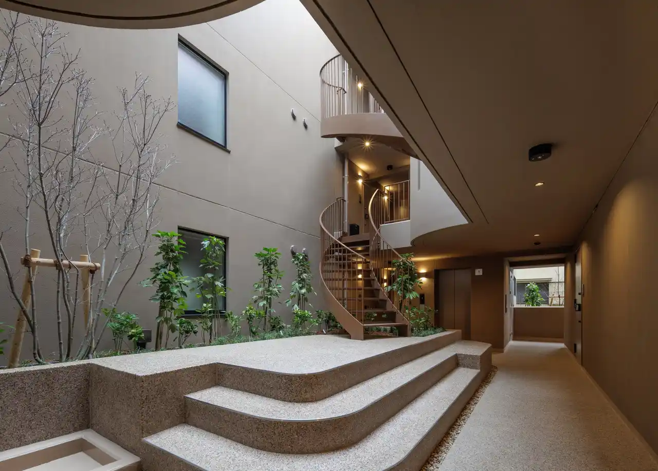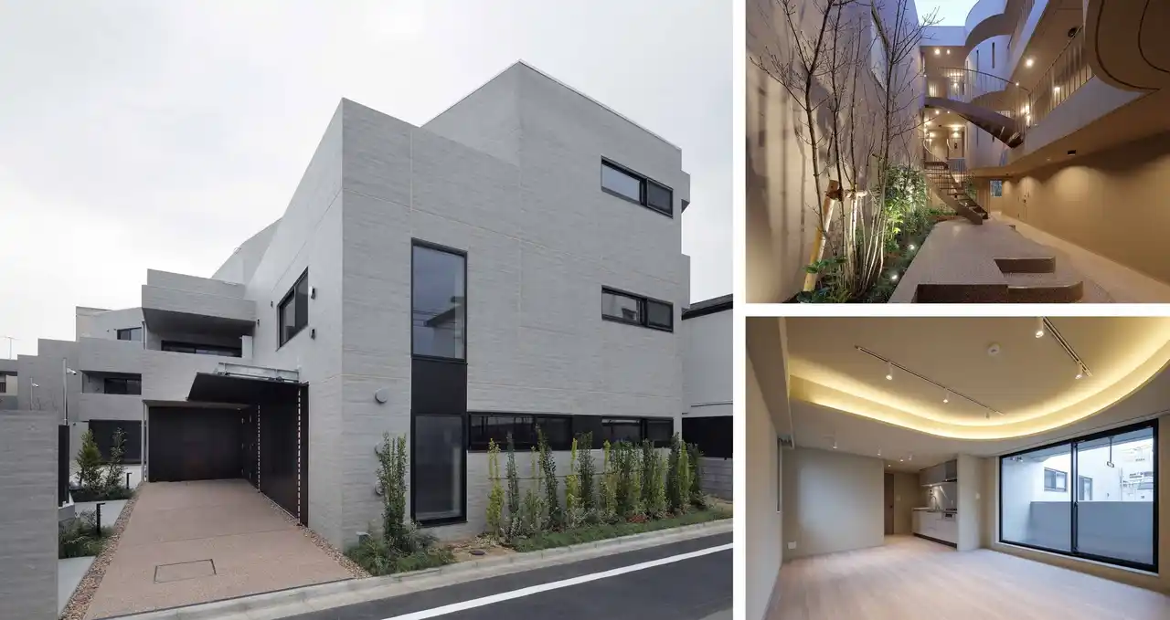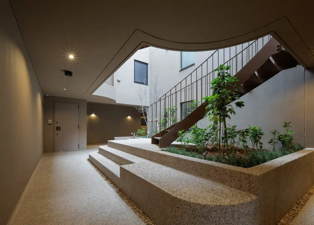 本物件は、株式会社アラキ+ササキアーキテクツとhiro nakata atelierの設計です。扇形の敷地形状を生かし、入口を抜けて奥へ進むと空間が大きく広がり、中央には曲線を描く階段が印象的な中庭を配置しています。外部からは想像できない開放的な内部空間が現れ、洞窟のような奥行きとワクワク感を備えた住環境を創出しています。 |