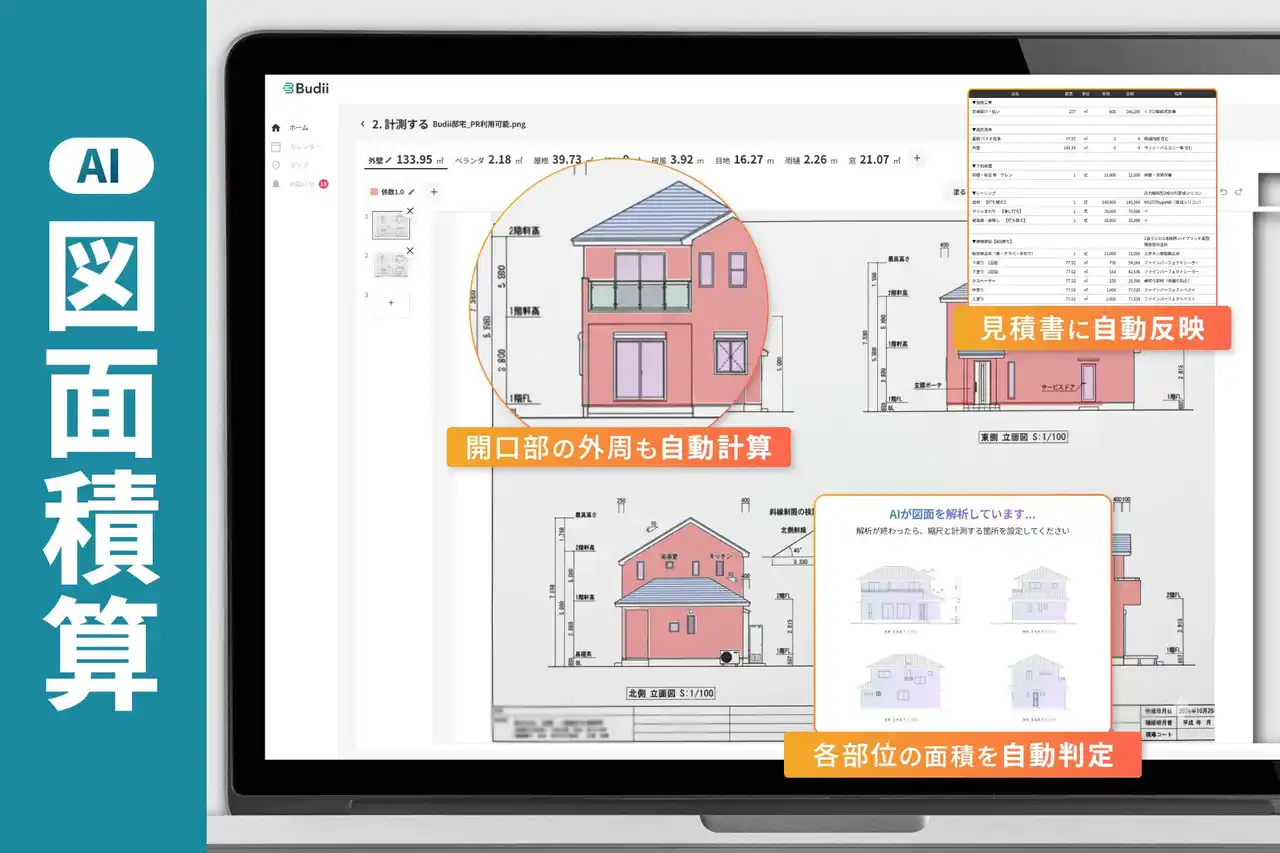 | BudiiのAI図面積算は、立面図を取り込むだけでAIが建物を解析し、外壁・屋根・付帯部など部位ごとの面積を即時に算出します。面倒な開口部の外周も自動計測されるので、目地の長さまで正確に見積りすることができます。 | |||