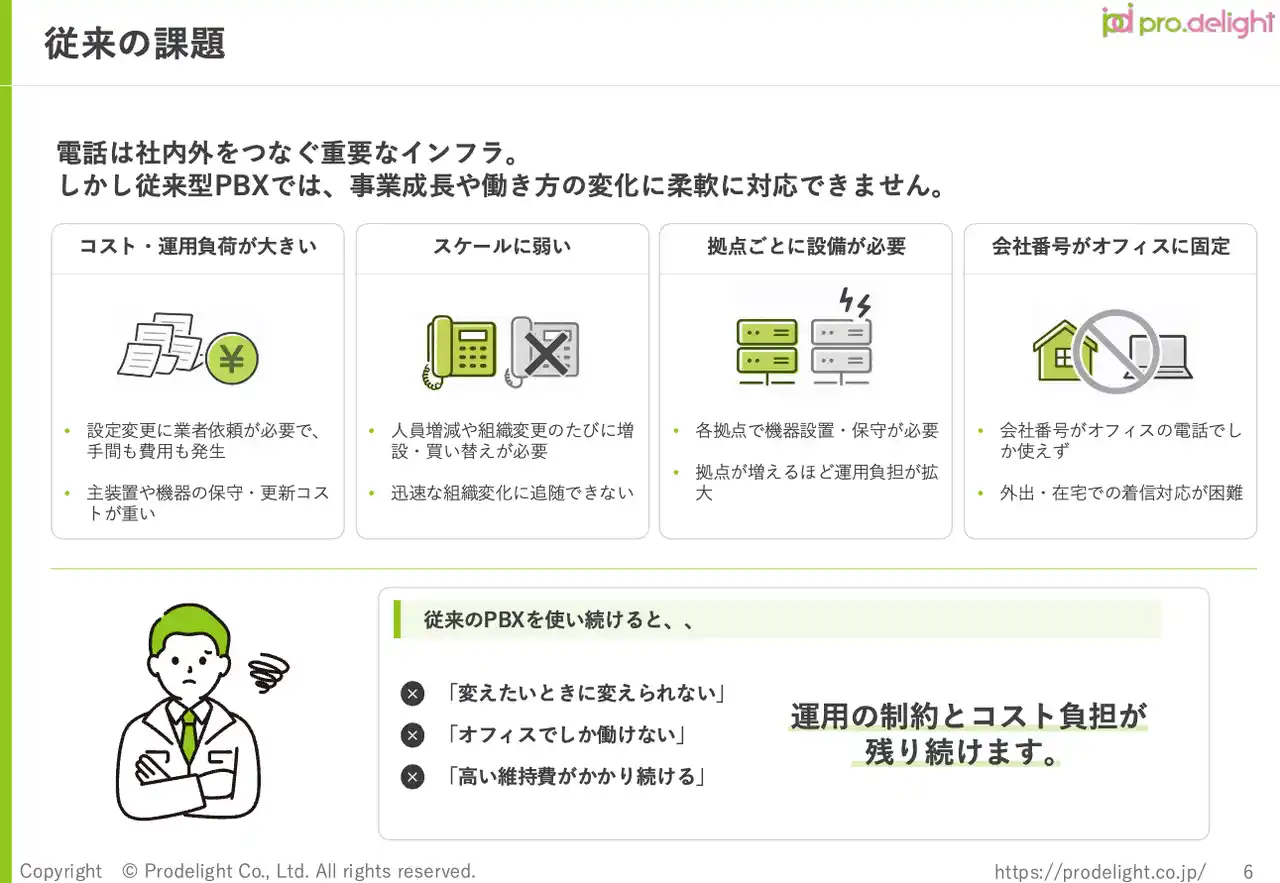 電話のDXを推進する株式会社プロディライト(大阪市中央区:代表取締役社長 小南 秀光、証券コード:5580、以下プロディライト)は、クラウドPBX「INNOVERA」の導入を検討されている企業担当者様向けに、オンプレミスPBXの課題解決方法やサービス概要、よく使われる機能、基本構成、導入事例などを体系的にまとめたホワイトペーパーを刷新したことをお知らせいたします。 |