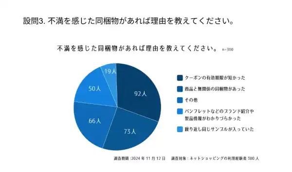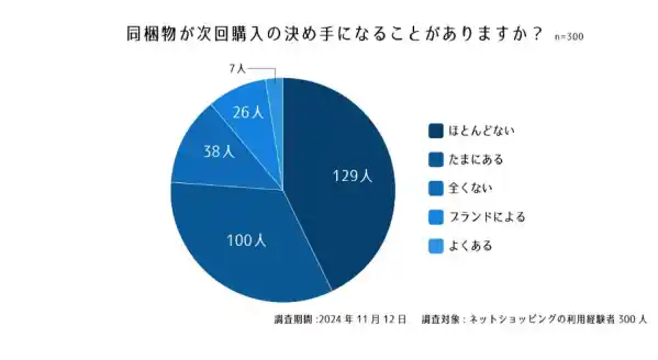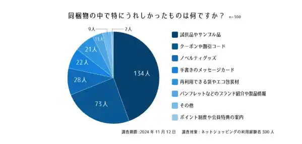 設問1. 最近購入した商品には、どのような同梱物が入っていましたか?設問2. 同梱物の中で特にうれしかったものは何ですか?設問3. 不満を感じた同梱物があれば理由を教えてください。設問4. 同梱物が次回購入の決め手になることがありますか?