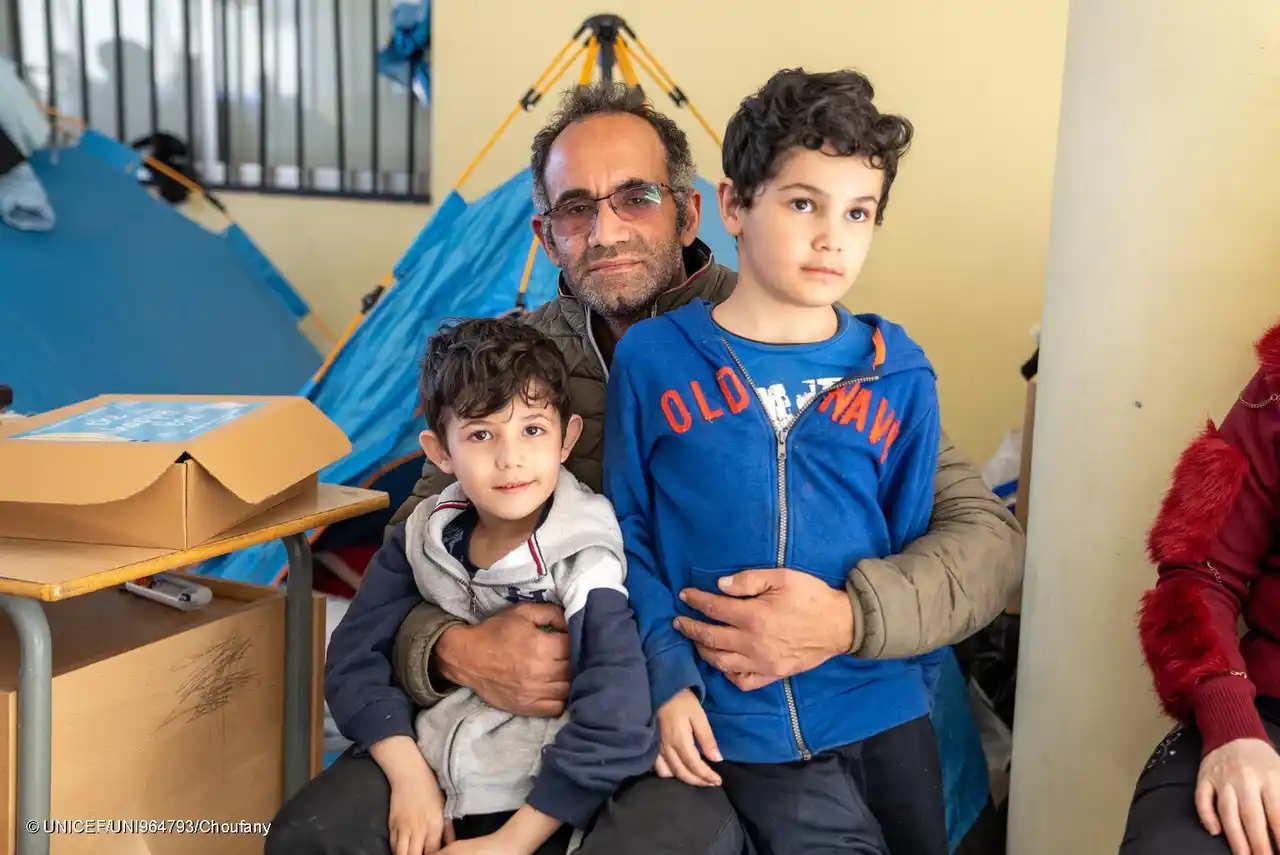 避難生活を送るベイルートの学校で、6歳のジャワードさん(左)と7歳のユーセフさん(右)を抱きしめる父親のジハードさん(中央)(レバノン、2026年3月17日撮影) (C) UNICEF/UNI964793/Choufany |
