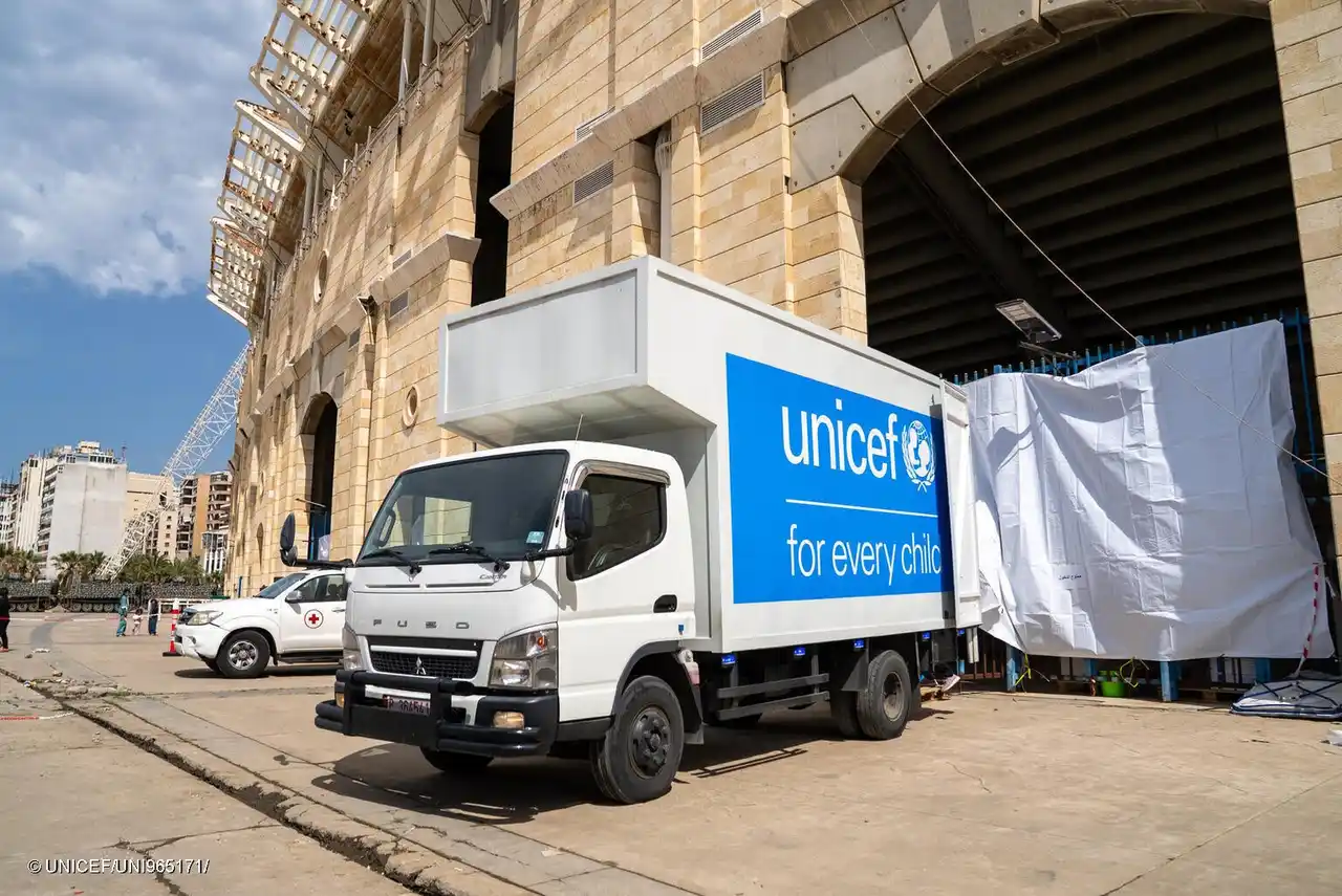 ベイルートのスポーツ施設内に新たに設置された避難所へ、支援物資を運び込むユニセフのトラック(レバノン、2026年3月18日撮影) (C) UNICEF/UNI965171/Choufany |
