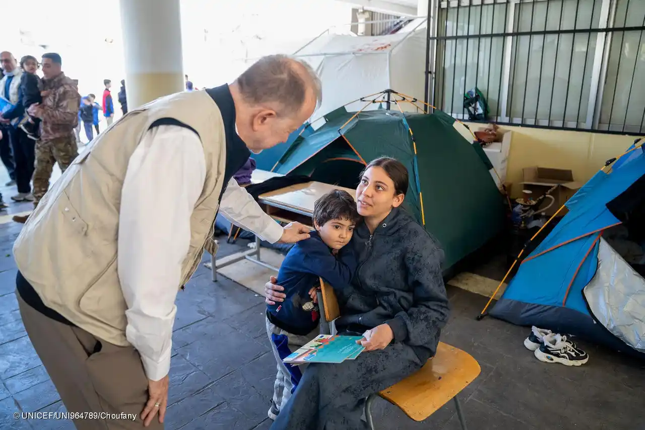 避難所となっているベイルートの学校で、避難民の家族から話を聞くユニセフのテッド・チャイバン事務局次長(レバノン、2026年3月17日撮影) (C) UNICEF/UNI964789/Choufany |