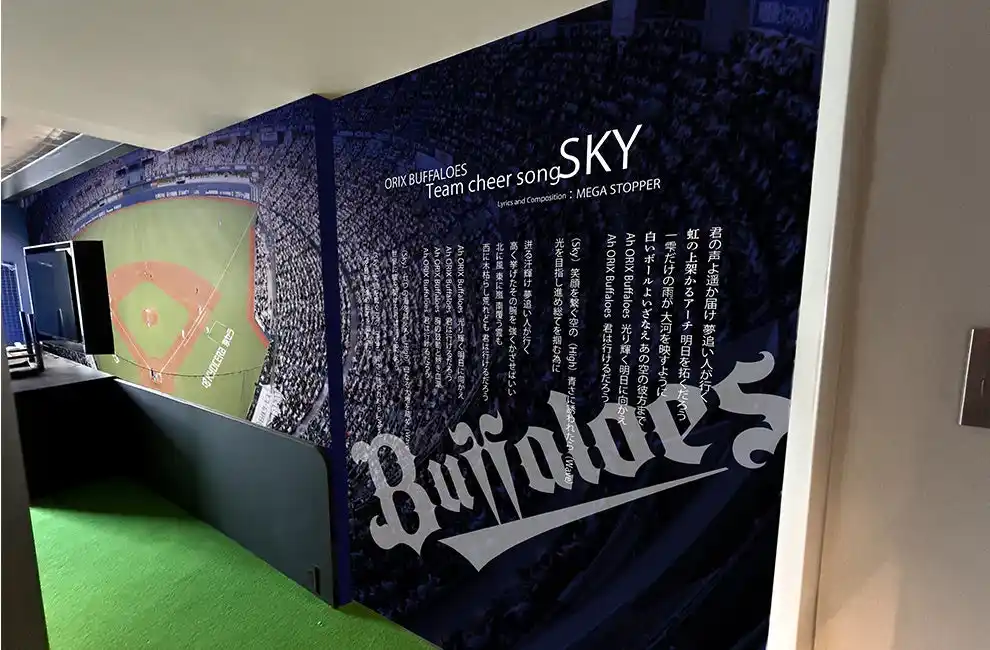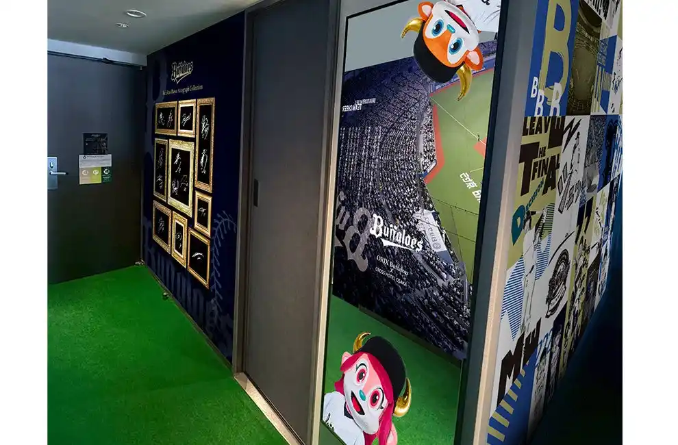 客室の扉はオリックス・バファローズの新しいロゴと、球団カラーのゴールドとネイビーをバランスよく配したデザインが施され、入室前からわくわくする空間へ誘います。入室すると足元からグラウンド感を感じる人口芝を敷き詰めた床が広がり、右側にはラッキーセブンを盛り上げる球団応援歌「SKY」の歌詞が組み込まれた京セラドーム大阪のパノラマウォールシートを配置。左側には選手のサインがデザインされたウォールシートがお出迎えします。