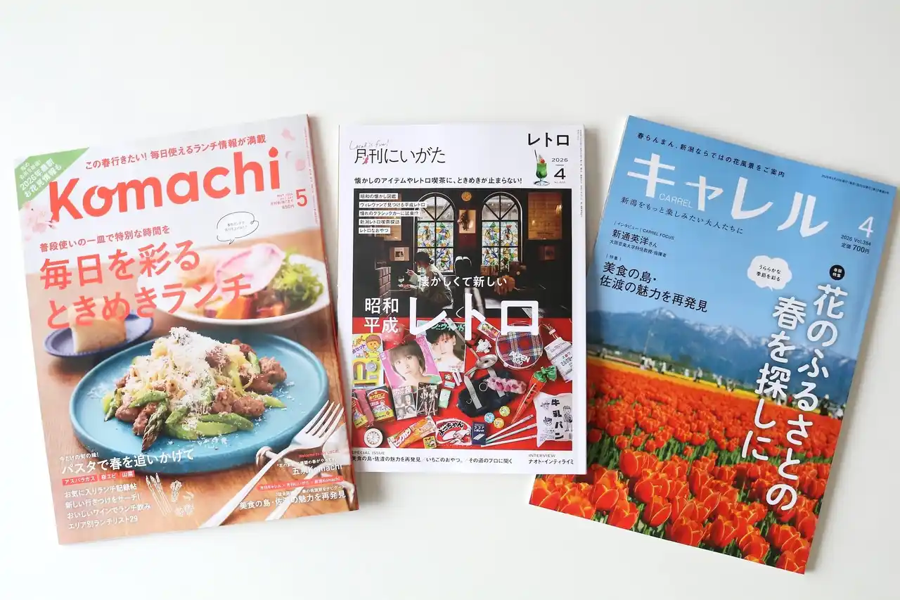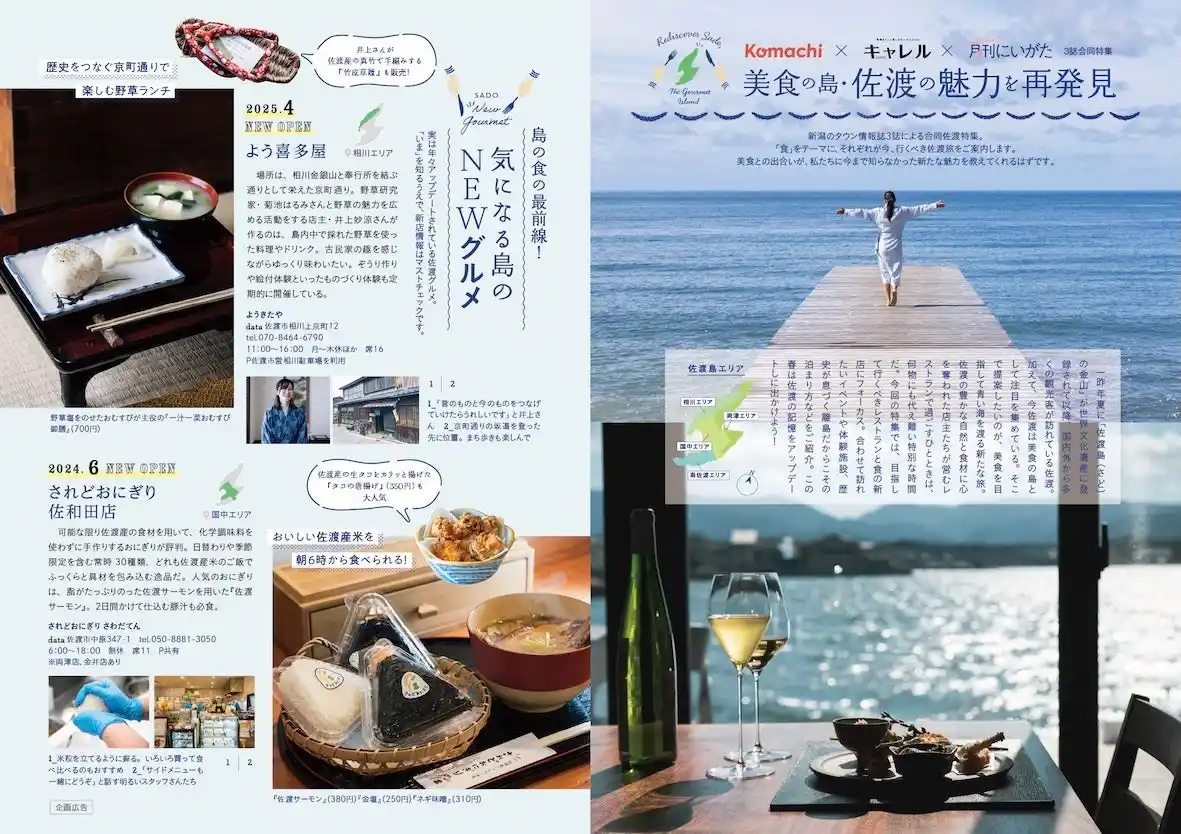 新潟県新潟市で情報誌「月刊にいがた」やウェブメディア「日刊にいがた」を運営する株式会社ジョイフルタウンは、同じく同市で情報誌「新潟Komachi」やウェブメディア「Komachi Web」等を運営する株式会社ニューズ・ライン、大人向け情報誌「月刊キャレル」を運営・制作する新潟日報メディアネット、株式会社DI Paletteとの共同企画を実施。2026年3月発売号の3誌で合同特集「美食の島・佐渡魅力を再発見」を掲載しました。 |