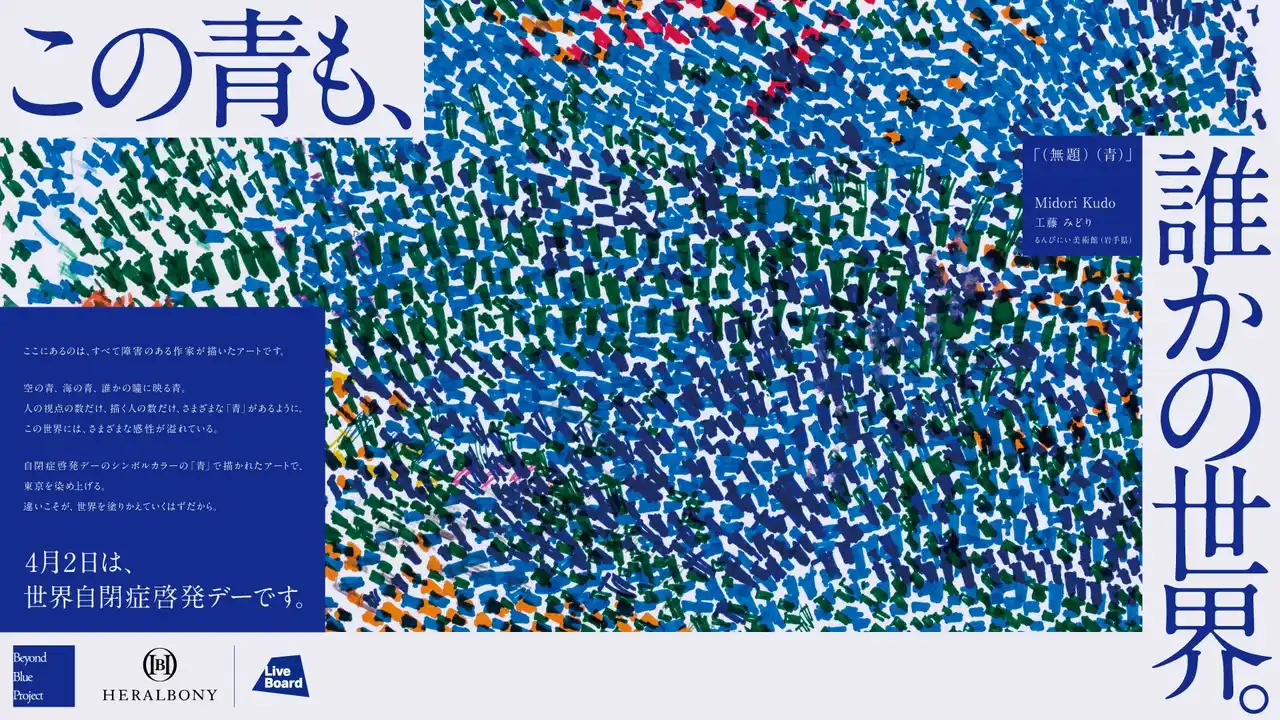 株式会社 LIVE BOARD(本社:東京都渋谷区 代表取締役社長 田中 淳泰 以下、LIVE BOARD)は、株式会社ヘラルボニー(本社:岩手県盛岡市 代表取締役 Co-CEO 松田 崇弥・松田 文登 以下、ヘラルボニー)が世界自閉症啓発デーに合わせ実施する「Beyond Blue Project」に参画いたします。本プロジェクトの一環として、2026年4月2日(木)~4月15日(水)の期間、LIVE BOARDが保有する東京都内のデジタルOOHにて、自閉症啓発デーのシンボルカラーである「青」のアートを放映いたします。 |