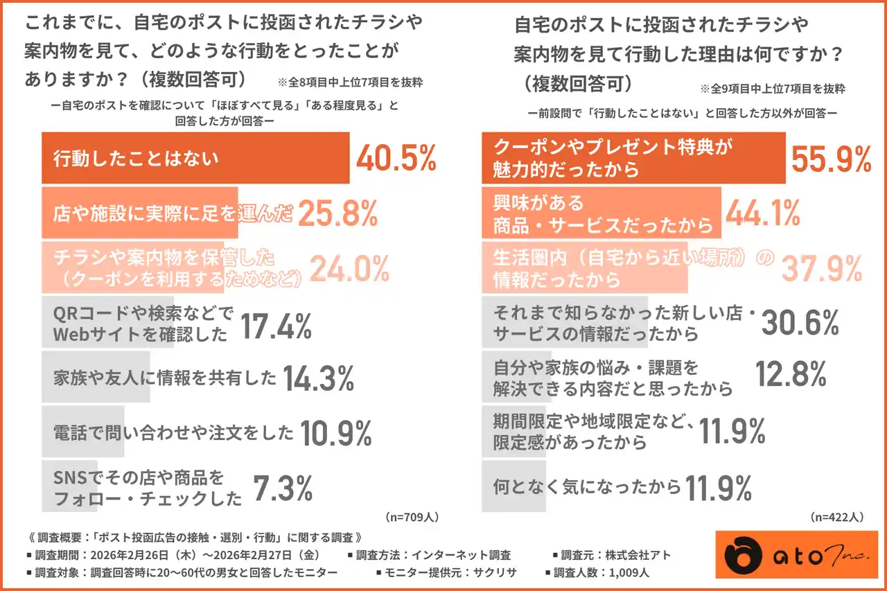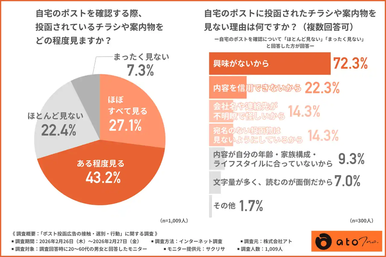 株式会社アト(所在地:東京都千代田区、代表取締役社長CEO:奈須田 洋平)は、20~60代の男女を対象に、「ポスト投函広告の接触・選別・行動」に関する調査を行いました。