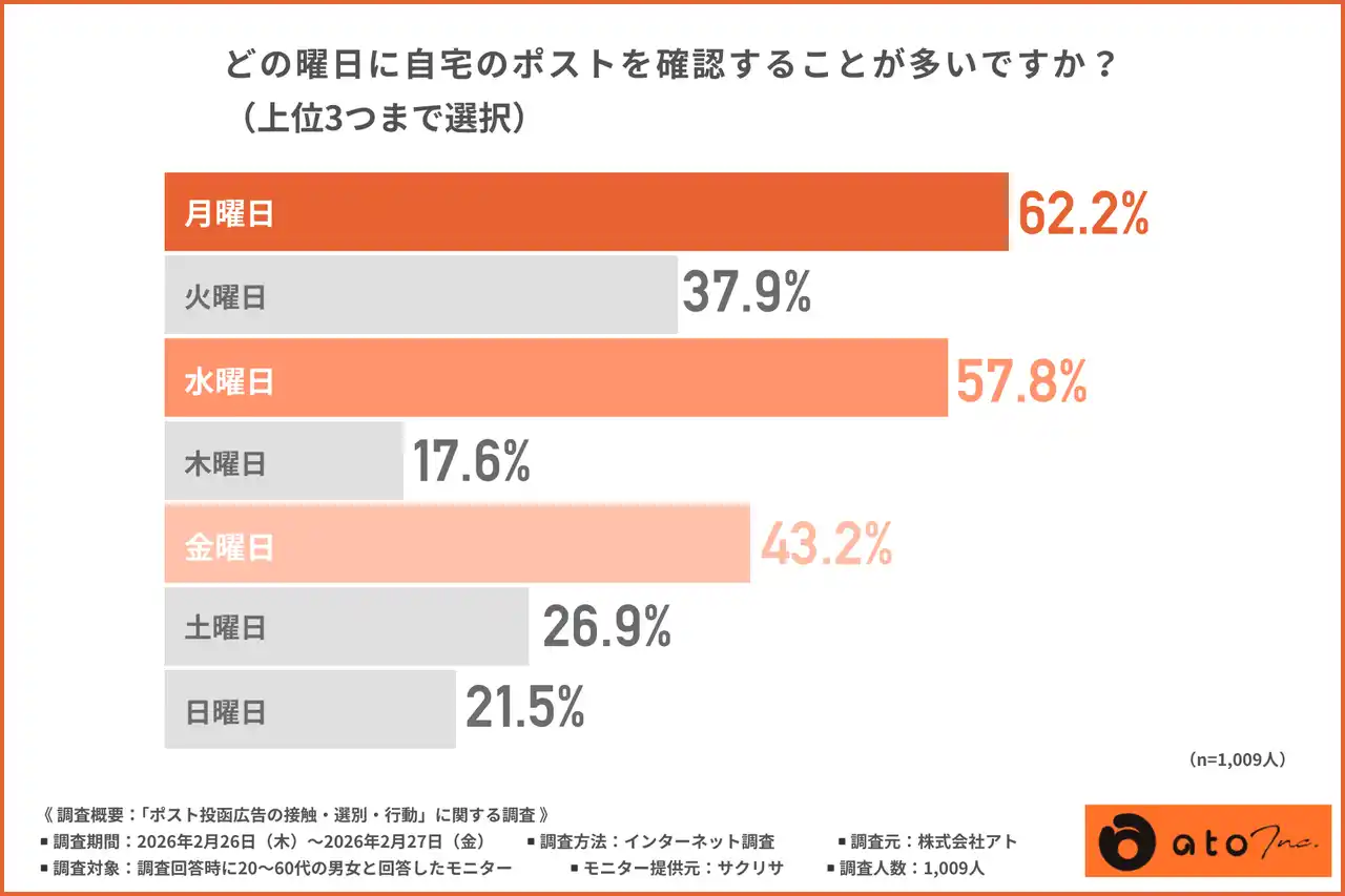 「どの曜日に自宅のポストを確認することが多いか」と尋ねたところ、『月曜日(62.2%)』と回答した方が最も多く、『水曜日(57.8%)』『金曜日(43.2%)』となりました。 |