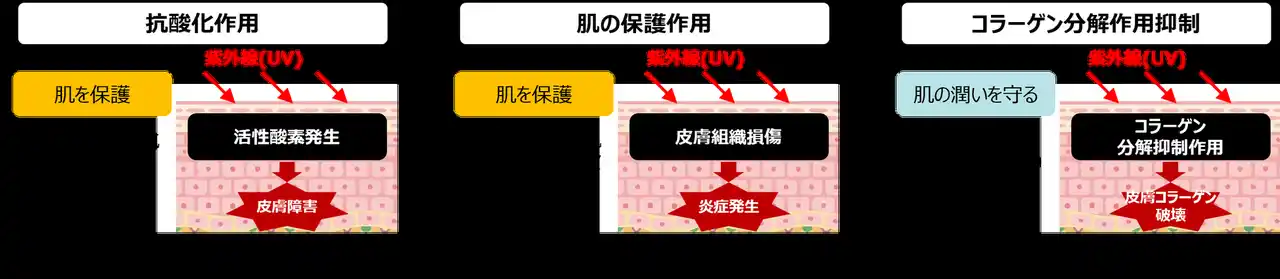 アスタキサンチンには、肌に大きなダメージをもたらす紫外線(UV)により発生した活性酸素*を減少させ、皮膚の損傷を抑制し、肌を保護し、またコラーゲン分解酵素の増加を抑えることで、肌の潤いを守ることが、研究レビューの論文からも評価されています。 |