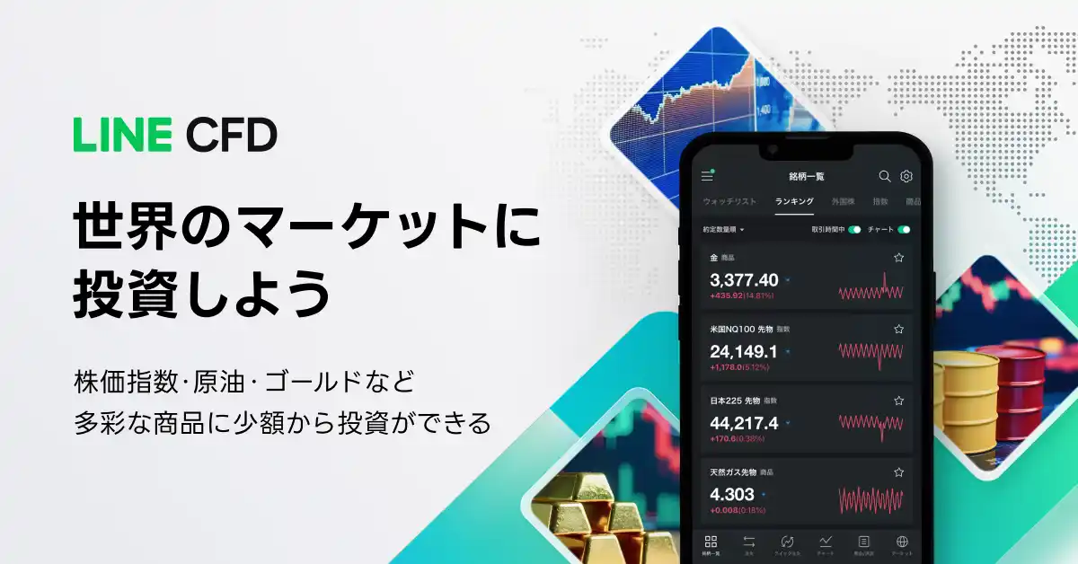 「LINE CFD」は、手数料0円で少額から投資が可能です。使いやすい取引ツールとLINE通知の連携により、金や原油、米国株などの世界中のマーケット変動をいち早く捉え、いつでも快適に資産運用を行っていただけます。 |