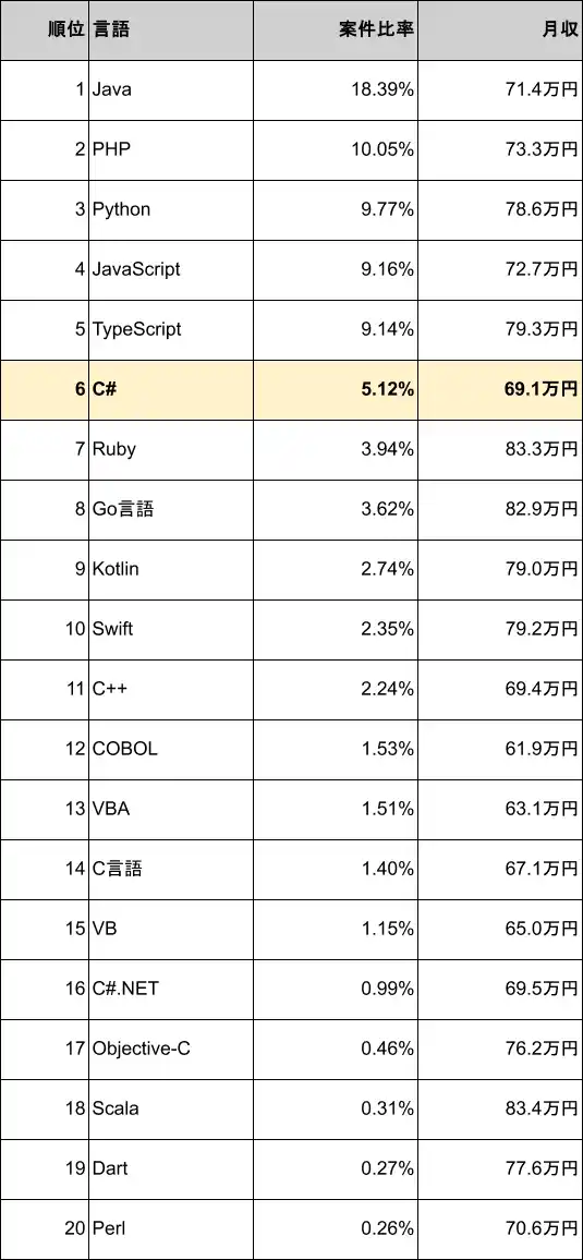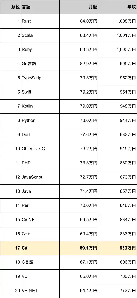 C#の案件別平均年収ランキングは17位(830万円) |