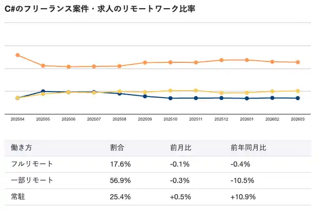 2026年3月時点のC#向けフリーランス案件・求人におけるリモートワーク比率は、フルリモートが17.6%、一部リモートが56.9%、常駐が25.4%となっています。 |
