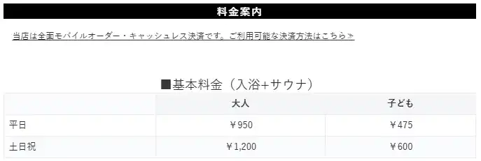 月~木 11:00~21:45(毎月第一水曜日のみ12:00~) ※最終受付 21:30 金~日・祝 11:00~23:00 ※最終受付 22:30 ※自動オートロウリュ 初回 11:10 / 40分毎 |