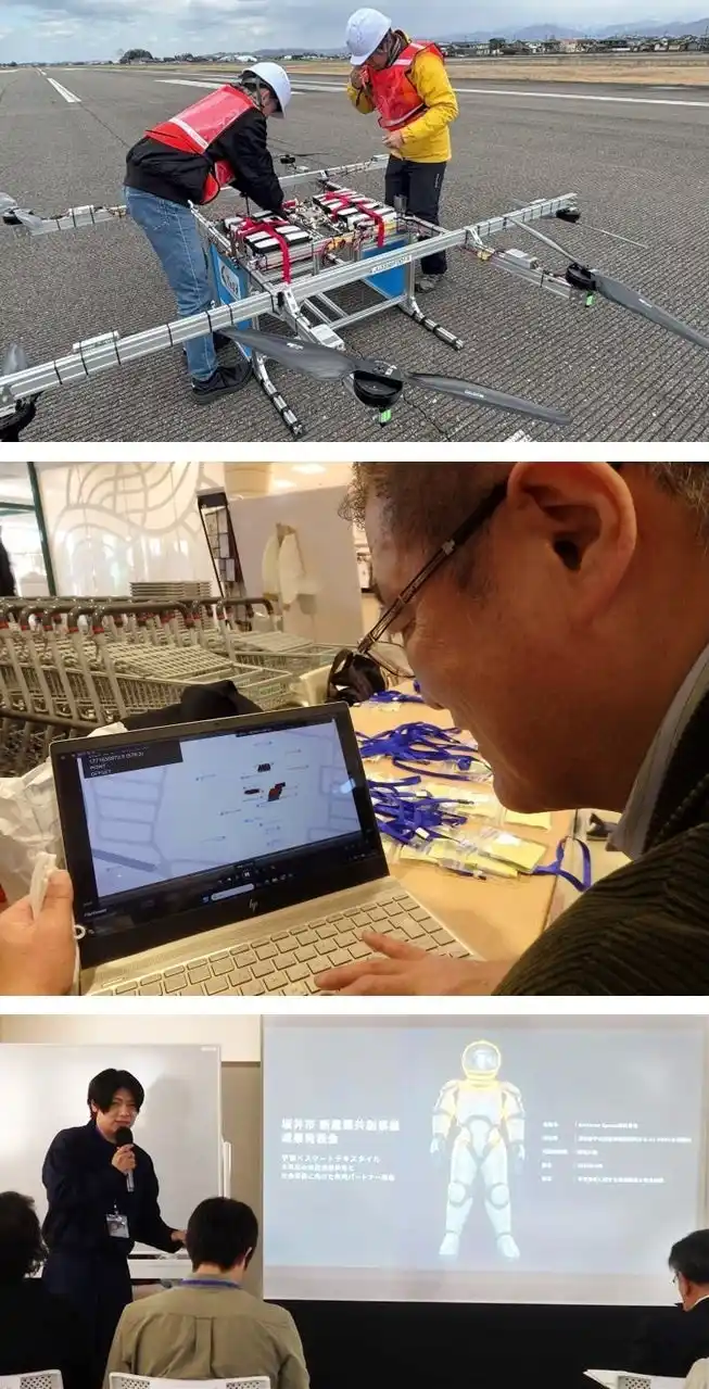 (写真上)福井空港でドローンの飛行試験を行う金沢工大のスタッフ。(写真中)坂井市内のショッピングセンターアミで独自のシステムによる実証を行うサイトセンシングの平林社長。(写真下)宇宙服の研究をベースに、スマートテキスタイルの開発などを報告するAmateseras Spaceの蓮見社長 |