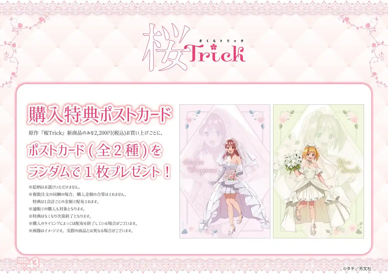 | 通販、または店頭で『桜Trick』の新作グッズのみを1会計で2,200円(税込)お買い上げごとに、ポストカード(全2種)をランダムで1枚プレゼントします。 | |||||||||