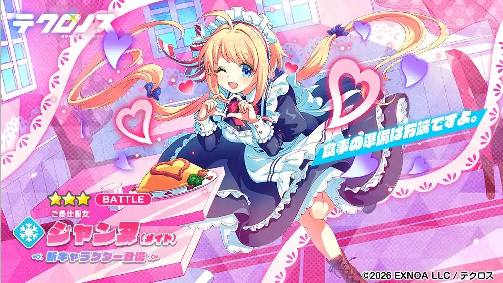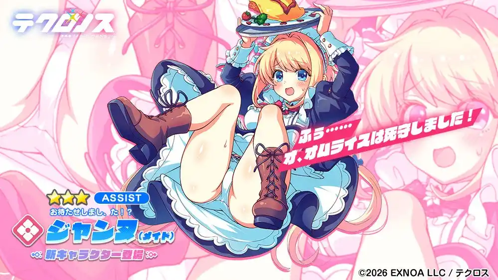 合同会社EXNOA(本社:東京都港区、CEO:東條 寛、URL:https://games.dmm.com)と株式会社テクロス(本社:京都府京都市右京区、代表:辻 拓也、URL:https://techcross.co.jp)は、4つの刻が交差するクロスヒロインRPG『テクロノス』(https://techcronoss.com)にて、メイド服姿の「ジャンヌ」が登場!あわせて、季節限定イベント「メイド・イン・ドリィミア」を開催します! |