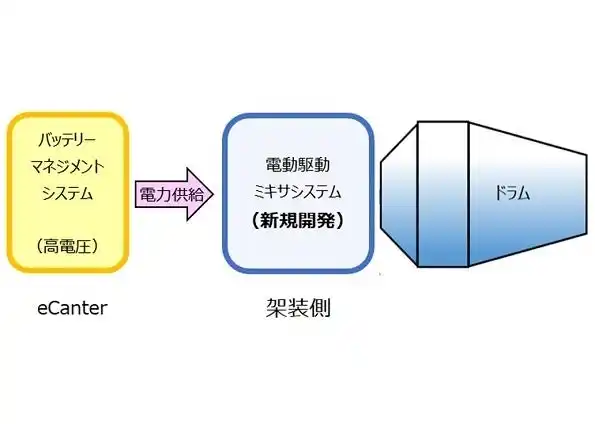 | 今回実装した電動化ミキサシステムは、従来のディーゼル車でドラムを駆動する際に必要としていた動力取り出し装置(PTO)を不要とし、EVトラックの高電圧バッテリー電源を直接供給源とすることで軽量化や低騒音化を実現しています。 | ||||||||||||||||