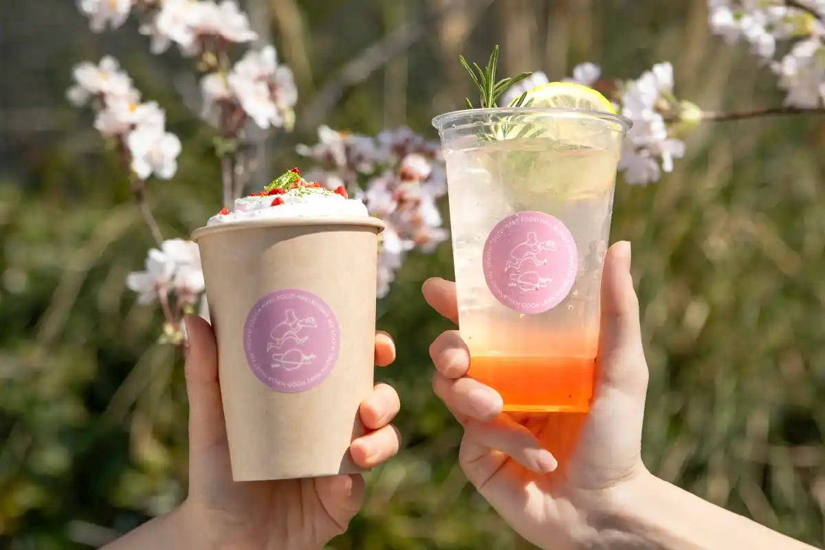 | ピンク色のロゴが可愛い今年のスイーツドリンクは、鮮やかな桜色のレモネードとホッとあたたまる抹茶オレの2種類。桜をバックに手に取って写真を撮っていただくのもおすすめです♪ | |||