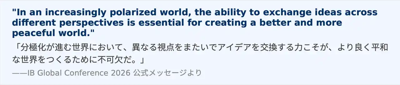 IB が長年大切にしてきた「異文化理解・批判的思考・対話」の精神がテーマに反映されており、世 界の教育者たちがこの問いに向き合っています。 |
