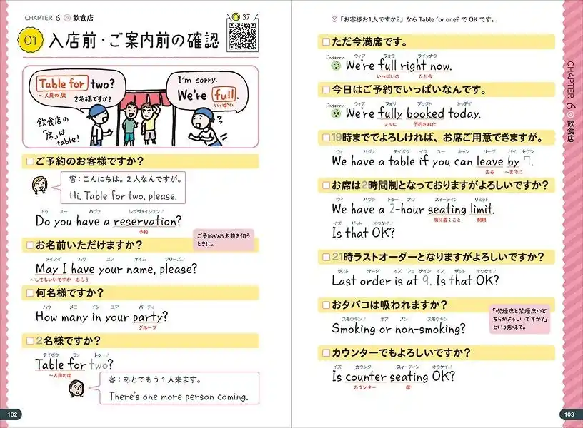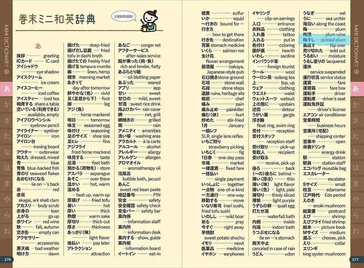 | 「○○って英語で何て言うんだろう…?」といった突然の困りごとも、ミニ和英辞典がついているので安心。「相席する」、「雨よけカバー」など、ぱっと英語が思い浮かばない単語も日本語から簡単に引くことができるので、接客現場でもすぐに役に立ちます。隙間時間にパラパラと眺めているだけでも、「この日本語はこう訳すのか!」という驚きがあるかもしれません。 | |||||||